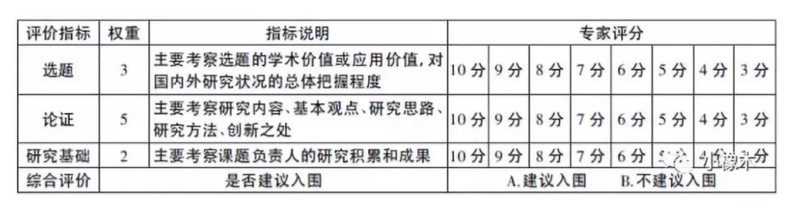 通讯评审社科基金项目时,评审专家须根据国家社科办提供的评审意见表(见下表)给每份申请书逐项打分,最高分为10 分,最低分为3 分,然后基于分数综合决定项目是否“入围”,即项目是否能够“出线”,参加“会评”。