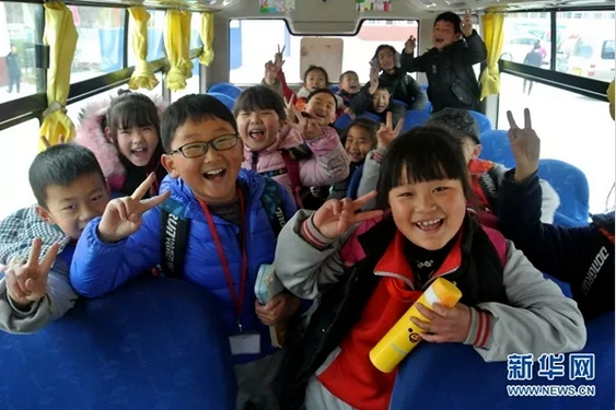 ▲ 照金北梁红军小学学生在校车上合影(新华社记者梁爱平 2018年12月4日摄)