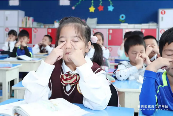 ▲ 武汉市汉江区红领巾学校学生正在做眼保健操。(张劲松摄)