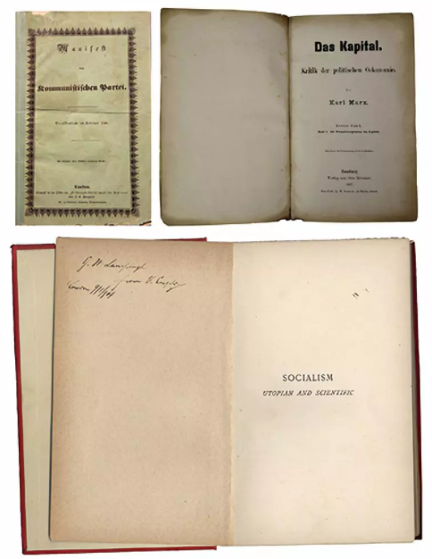 左上图为1848年《共产党宣言》德文第一版。右上图为1867年《资本论》德文第1卷第一版。下图为恩格斯的题字赠书《社会主义从空想到科学的发展》,1892年英文版。