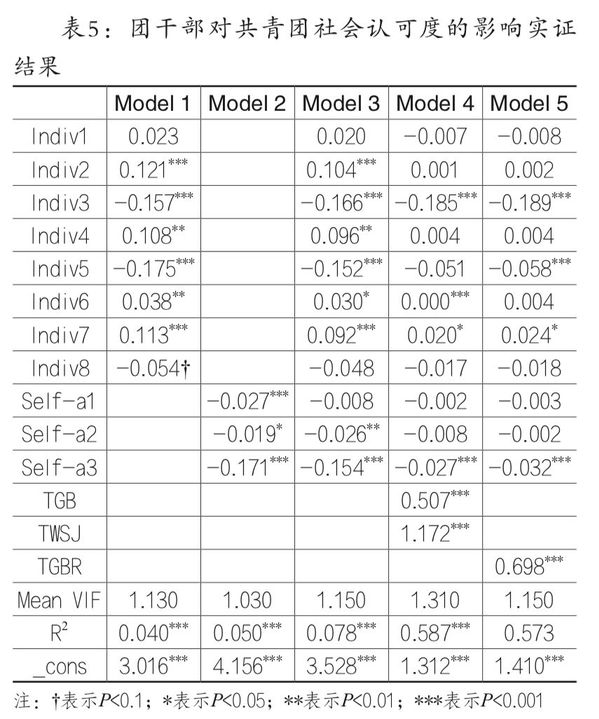 在表5中,Indiv1~Indiv8分别表示性别、年龄、民族、宗教信仰、政治面貌、户口类型、受教育程度、婚姻状况;Self-a1~Self-a3分别表示社会阶层、生活状况、改革收益情况等;TGB为团干部评价,TWSJ为团委书记评价,TGBR为总体评价(团干部认可度);Mean VIF表示平均方差膨胀性因子,cons为常数,R2为方差解释量。