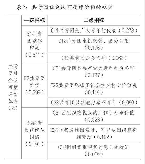 为了更好地对共青团的社会认可度进行综合定量评价,本报告采用利用权重计算综合得分情况。考虑社会认可度的测量涉及多维度,因此采用改进型层次分析法来计算各测量指标的权重。具体计算过程如下: