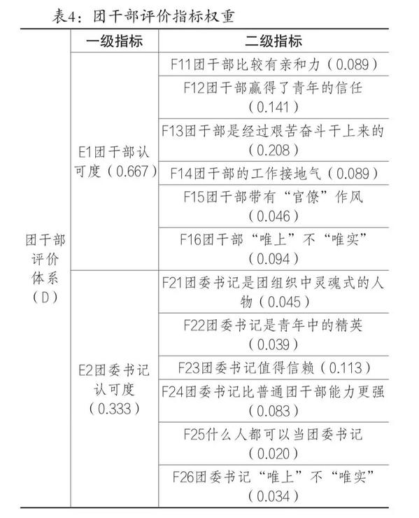 (1)从各级团委部门、高校和研究机构组建权重确定专家小组,各选定专家要求熟悉共青团工作,一般要求各领域的专家、高校或各级团委的主要管理者;